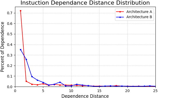 b. 设有2个不同架构的处理器平台,现分别于其上运行由相同版本编译器所编译的测试程 序,并分别在这两个平台上使用insDependDist工具对该测试程序进行插桩分析,得到如 图6-1所示的指令依赖距离分布图。请问架构A、B之中谁具有更多的寄存器?为什么?