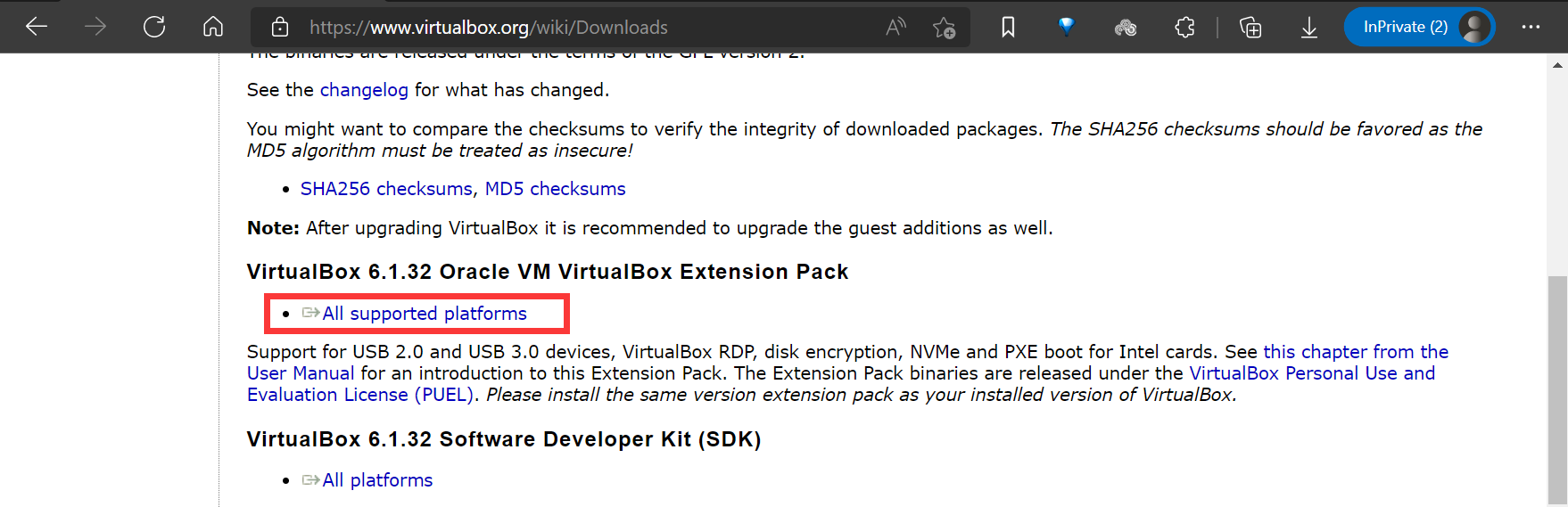 首先,打开VirtualBox官网的下载页,点击下载扩展包,如图1所示。