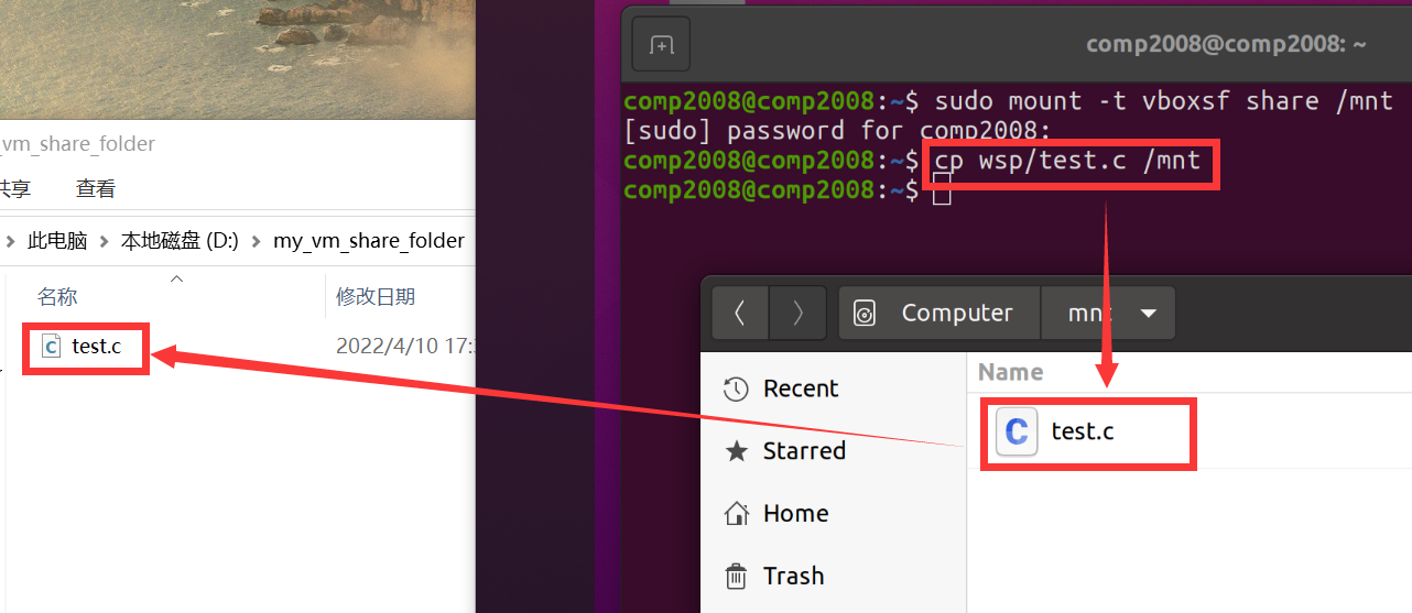 挂载成功后,即可使用cp命令将所需的文件拷贝到/mnt目录,或使用GUI操作在主机和虚拟机之间拷贝文件。比如,将~/wsp/test.c文件拷贝到Windows,如图10所示。
