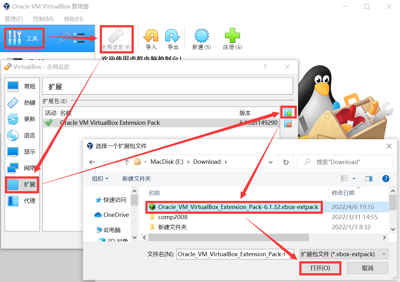 然后,打开VirtualBox,依次点击 工具 -> 全局设定 -> 扩展 -> 添加新包,选中下载好的扩展包,如图2所示。