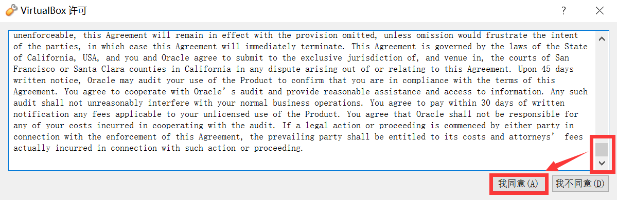 此时,将自动弹出VirtualBox许可声明窗口。用鼠标滚轮滑到最底下,点击“同意”按钮,如图3所示。