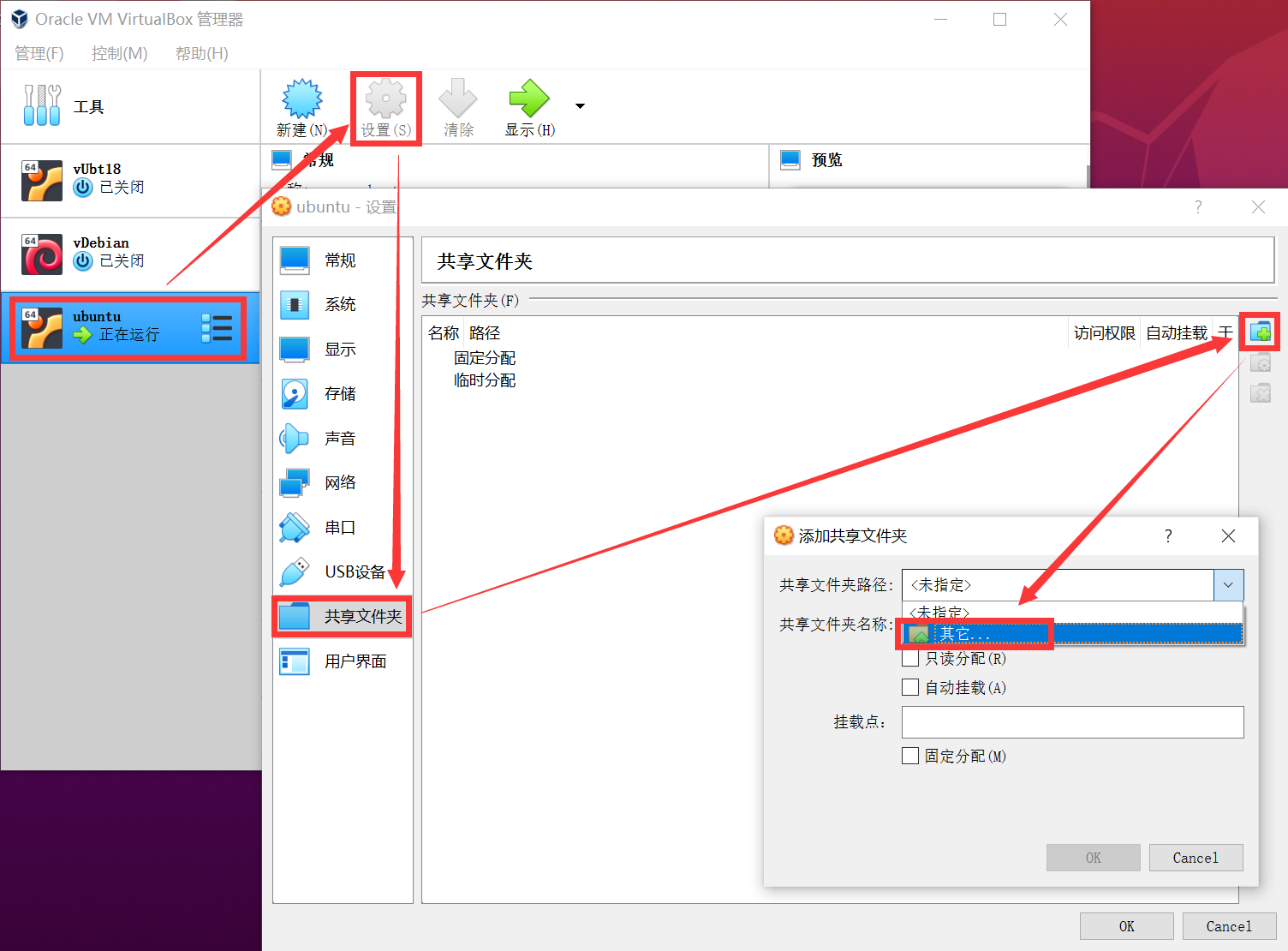 选中虚拟机,并依次点击虚拟机的 设置 -> 共享文件夹 -> 添加共享文件夹,然后在 共享文件夹路径 右侧点击下拉选择 其他,如图4所示。