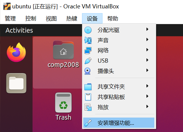 启动虚拟机,然后依次点击菜单 设备 -> 安装增强功能,如图7所示。