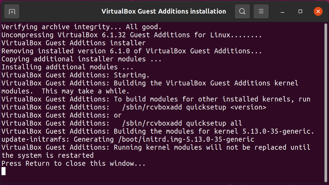 按照终端的提示,按下回车键关闭终端,即完成增强功能的安装。接下来可继续下一步骤来挂载共享文件夹。若挂载失败,可先重启虚拟机再尝试,或翻看安装日志中是否有报错信息,以检查增强功能是否安装失败。