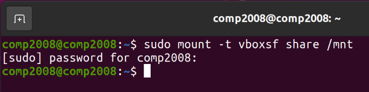 打开终端,输入sudo mount –t vboxsf share /mnt命令,然后输入root密码并回车,如图9所示。该命令将Windows下的共享文件夹挂载到虚拟机的/mnt目录。